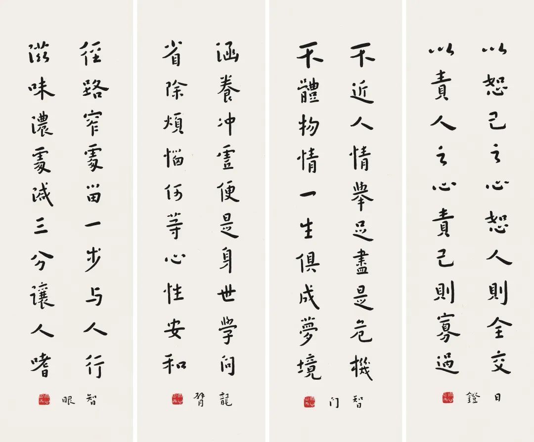 这四幅格言,就像四盏明灯,照亮人生路。弘一法师用简单的字,说透了做人的道理,让人一看就懂,一学就会。他的字,朴拙中带着风骨,就像他的人,淡泊中透着智慧。这“十字格言四屏”,不仅是书法艺术的瑰宝,更是人生哲学的宝典。读一读,品一品,让心灵得到净化,让生活更加美好。